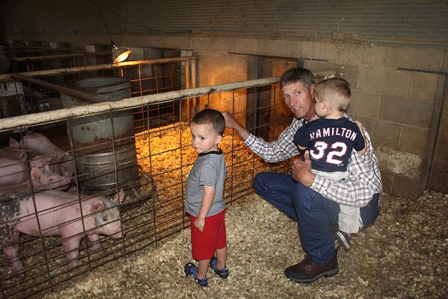 When we got to Weatherford we checked in to our hotel and headed off to Uncle Tim and Aunt Darla's FARM!!! The boys could not have been MORE EXCITED! It was so great to see the Lowry's! We ate a delicious meal and kept the boys at the table as long as possible... and then they were off! As soon as they got outside, they saw a FROG! Shortly after that, Braidy saw a snake! We were off to an AWESOME start :) Uncle Tim took both boys on the 4-wheeler and they got to see the cows and tractors! That made Crockett's weekend:) He even took us to see some piggies! Crockett wasn't too sure of them, but Braidy loved them! They loved him too, even tried to eat his shorts!! We had a lot of fun that night!